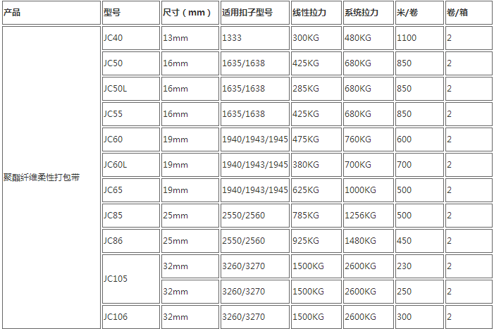 新闻中心滨州打包带生产厂家的打包带特性及型号 聚酯纤维柔性打包带是以聚对苯二甲酸乙二醇酯为主要原料经精加工而成的,它是目前世界上用于替代钢带的一种新型环保的包装材料。佳创是一家专业的滨州打包带生产厂家,工厂生产的产品越来越广泛地被化工、机械、木材、医疗、玻璃、铝锭、钢材、造纸、精密仪器等行业采用。聚酯纤维打包带以M型钢扣做连接,在设计合理的情况下,不仅连接牢固,而且在紧固状态下永不脱落打滑,大大提高了捆绑和运输过程中的工作效率性和安全性,其优点如下: 1、拉力强:高强抗拉力,能承受0.5-8.5吨的拉力,可取代传统钢带。 2、抗震性:由于它的延展性和变形后的回复性,纤维打包带可以比钢带更好地吸收冲击能量,并且在货物收缩或膨胀后不会变松。打好包后能保持长时间不松驰,有效吸收运输中的震动, 从而保证了货物在长途运输中具有卓越的抗冲击性, 3、安全性:它重量轻并且柔软,不需带手套作业;当它被剪断时也不会弹开,伤及运输工人和客户。因其质地柔软,用过的带子不但非常容易处理而且柔韧的质地同时可以保护产品的表面免受划伤。 4、接扣强度高:纤维打包带的特色是连接钢扣,是一种最牢固的连接方式,并且可以重复收紧;在某些应用中,打包扣可以重复使用。 5、不生锈不变质:聚酯纤维滨州柔性打包带能经得住各种气候条件的变化,能在130·C下正常工作,抗腐蚀性良好,在海水中亦可工作,永远不会沾污您的产品。 6、成本低:打包工具成本低,仅需要一把简单的工具,并且磨损很小,维修费用低。 很多企业对打包带的要求不同,有的客户需要的是纯料的打包带,有的可以需要的是印字的打包带还有客户需要的是彩色的打包带,但不管客户如何要求,打包带的质量永远是打包带的核心竞争力。企业在购买柔性打包带的时候往往会关注打包带的长度、价格、宽度等因素,打包带的价格是由生产工艺、用料等元素影响,因此不具有衡量的标准,如果要选择一款合适的打包带那么质量是唯一标准,只有高质量的打包带才能为企业节省成本,劣质的打包带虽然在购买的时候价格偏低可是造成的浪费更多,还有一些打包带还会造成打包机故障,根本无法实现自动打包,因此打包带的质量才是关键。佳创是一家专业的滨州打包带生产厂家,专业提供各类规格的柔性打包带给各企业朋友选择,规格尺寸如下: